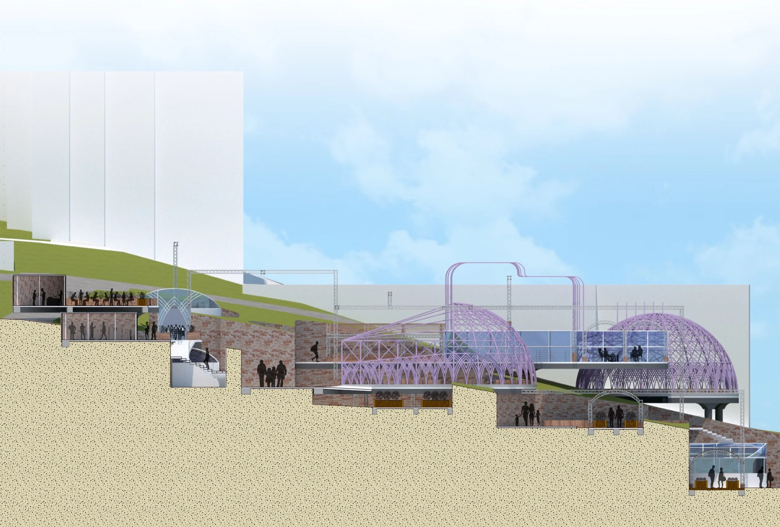Under the bridge, there is a back access for trucks to the storage. There are hangout spots throughout as well as a coffee shop. The structure is made from sustainable materials as the Green Ville food hub is an environmentally friendly location.